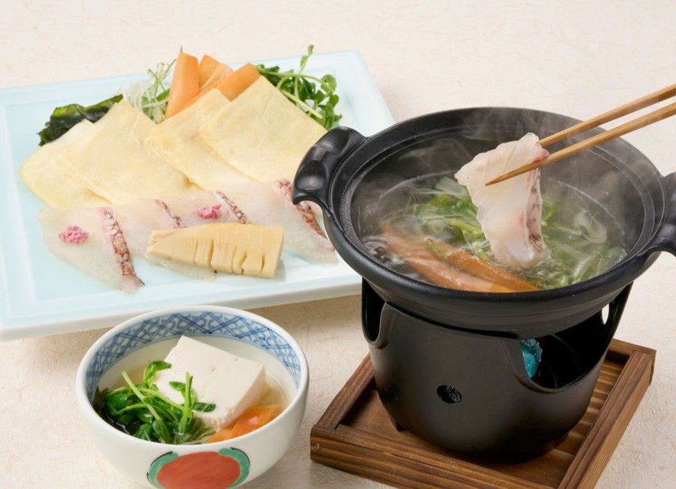春の特別懐石の一品「桜鯛と湯葉のしゃぶしゃぶ」では、旬の鯛を優しい味付けの出汁に潜らせて湯葉や野菜と共にお召し上がりいただけます。