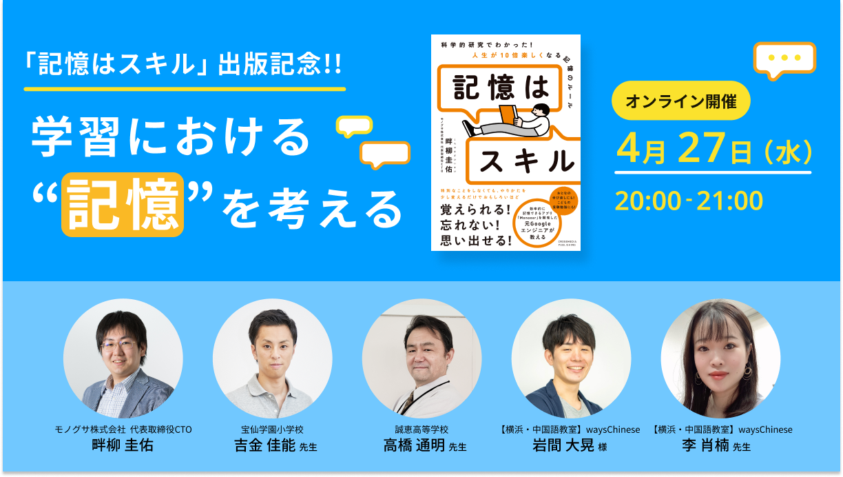 セミナーでは、著者が開発した記憶アプリ「Monoxer」を活用していただいている組織の先生方にもゲストとして登壇していただきます。「学習における”記憶”」をテーマに、さまざまな角度から記憶について掘り下げていきます。