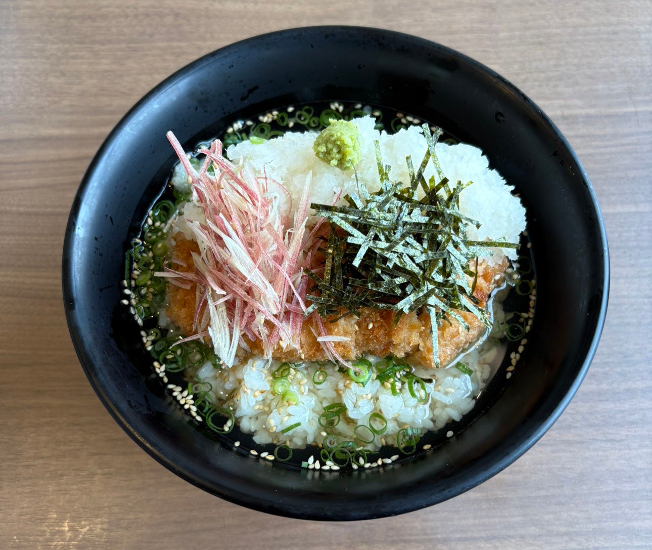 揚げたてのとんかつに、みょうが・大根おろし・わさびを添え、冷たい特製だしをかけて味わう“美楽亭オリジナル”の冷製どんぶり。
