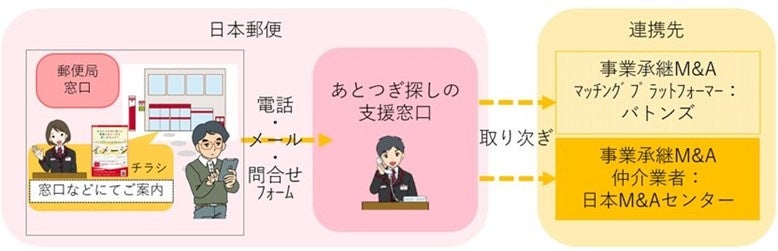 当社の連結子会社である株式会社日本M&Aセンター(以下、日本M&Aセンター / 本社:東京都千代田区 / 代表取締役社長:三宅 卓 / URL:https://www.nihon-ma.co.jp/)と株式会社バトンズ(以下、バトンズ / 本社:東京都千代田区 / 代表取締役:神瀬 悠一/ URL:https://batonz.co.jp/)は、日本郵政株式会社(以下、日本郵政 / 本社:東京都千代田区 / 取締役兼代表執行役社長:増田 寬也)および日本郵便株式会社(以下、日本郵便 / 本社:東京都千代田区 / 代表取締役社長兼執行役員社長:衣川 和秀)とともに2022年8月29日より近畿エリアの郵便局において、「あとつぎ探し」の支援サービスを開始しますのでお知らせします。