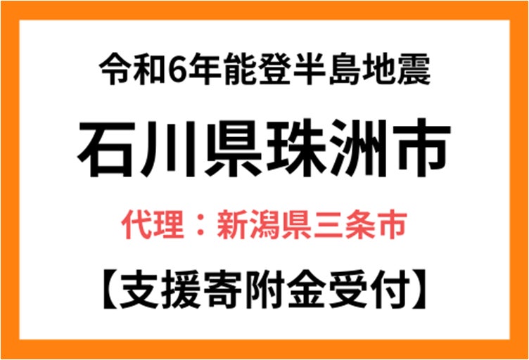 新潟県三条市(市長:滝沢 亮)は、令和6年1月1日に発生した令和6年能登半島地震により被災した石川県珠洲市に対して、ふるさと納税の災害支援代理寄附の受付を開始しました。代理寄付とは被災していない自治体が被災自治体の代わりに寄付を受け付ける仕組みです。この仕組みにより、被災自治体は寄付金受領証明書発行等の業務負担を大幅に減らし、優先度の高い災害対応に注力できるようになります。三条市がその業務を請負い、珠洲市に皆様からのご支援をお届けします。