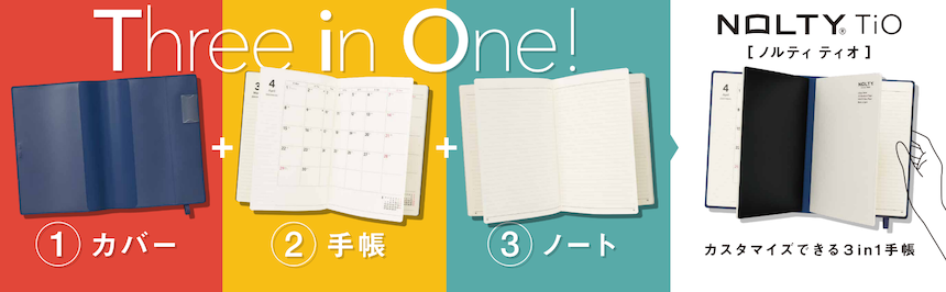 そんな多様化するユーザーのニーズにお応えして、「NOLTY TiO」シリーズは昨年登場しました。特長は、日付の入った手帳とノートを組み合わせて専用のカバーにセットし、自分のライフスタイルに合わせた1冊に仕上げることが出来る点です。自分に必要な機能に絞って手帳を使いたい方にオススメです。