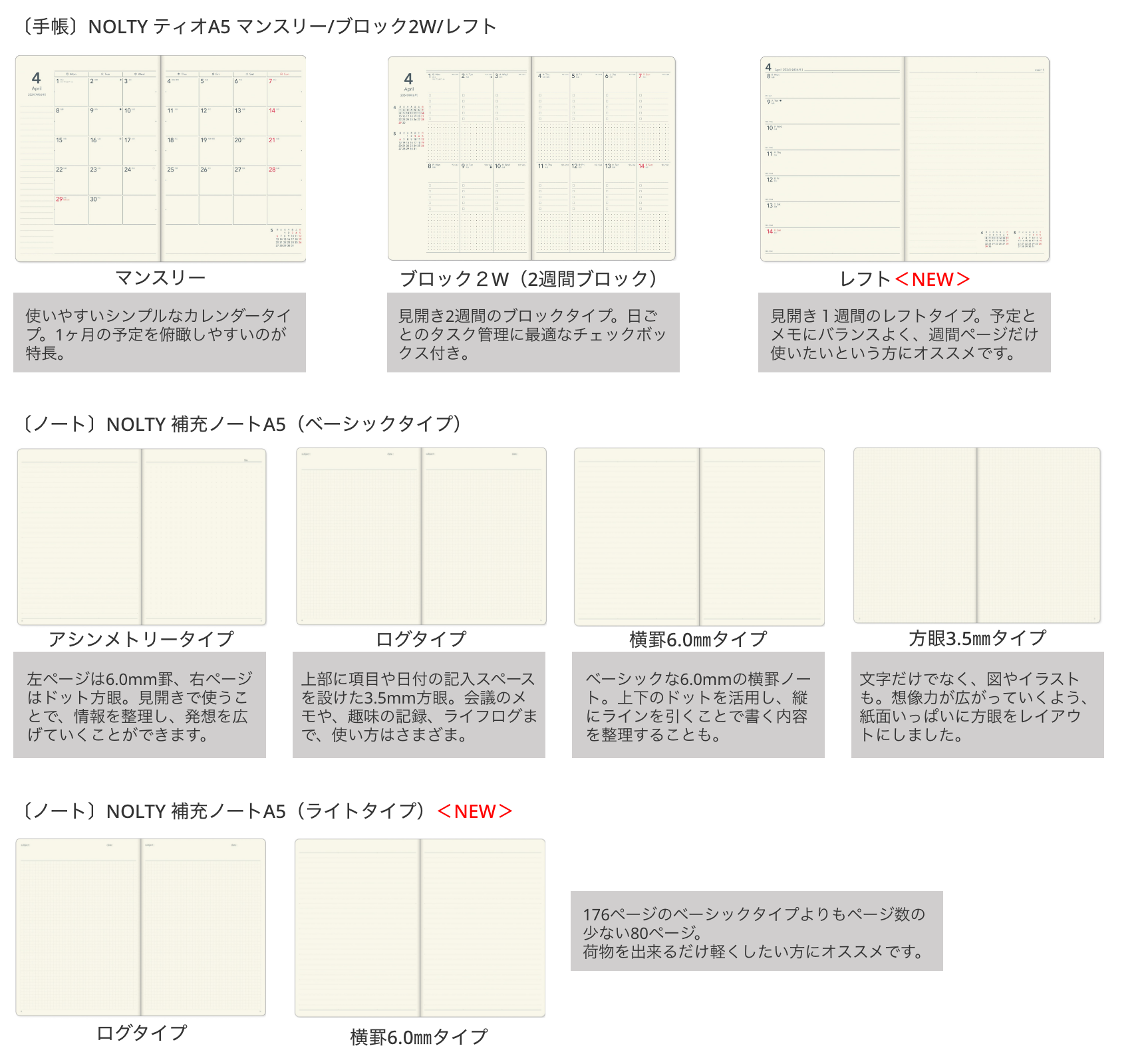 コロナ禍を経て自分の人生を見つめ直す方が増える中、仕事とプライベートを両立させ人生を充実させたいと願う方に向け、2つのことを1冊の手帳で整理できる新シリーズ「NOLTY アクセスB6 デュアルマンスリー」や、テレワークの定着によりデジタルを活用した働き方が増える中、デジタルツールとの併用を想定して必要な機能を選んで自分好みにカスタマイズできる「NOLTY TiO(ティオ)」シリーズに新たなラインナップが加わり、ライフスタイルの変化に合わせた新商品を含む全201アイテムを揃えています。