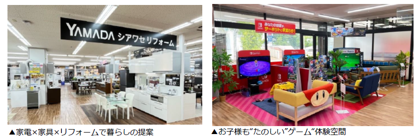 さらに、プロフェッショナルな従業員が「家電×家具」などトータルで暮らしの生活提案を行うだけでなく、家電や家具・インテリア等の使用感を実際に体験できるコーナーや、お子様も体験できるゲームコーナー等を設置し、お店で地域最大級の商品と極上のエンタメ空間でかつてない‘‘たのしい‘‘商品選びをご提供します。