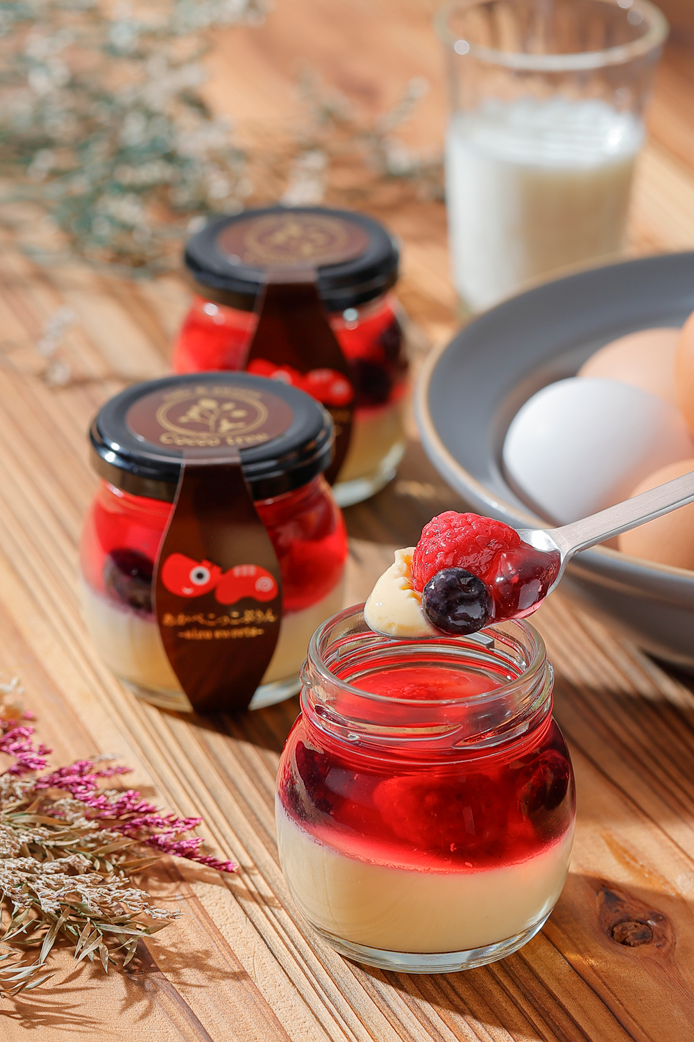 会津地鶏の卵と福島県内産の卵をブレンドし、会津の牛乳べこの乳を使用したとろ~りなめらかなぷりんとつるんとしたベリーのジュレを組み合わせました。「あかべこ×こっこぷりん」から「あかべこっこぷりん」と名付けました。