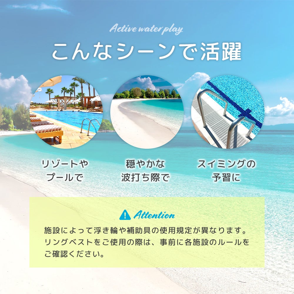 ※施設によって浮き輪や補助具の使用規定が異なります。リングベストをご使用の際は、事前に各施設のルールをご確認ください。