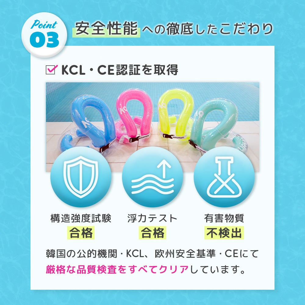 従来の浮き輪のように「乗る」のではなく、自ら「浮いて進む」感覚を遊びながら習得することにより、自分で泳げる!という自信と運動能力を自然に育みます。