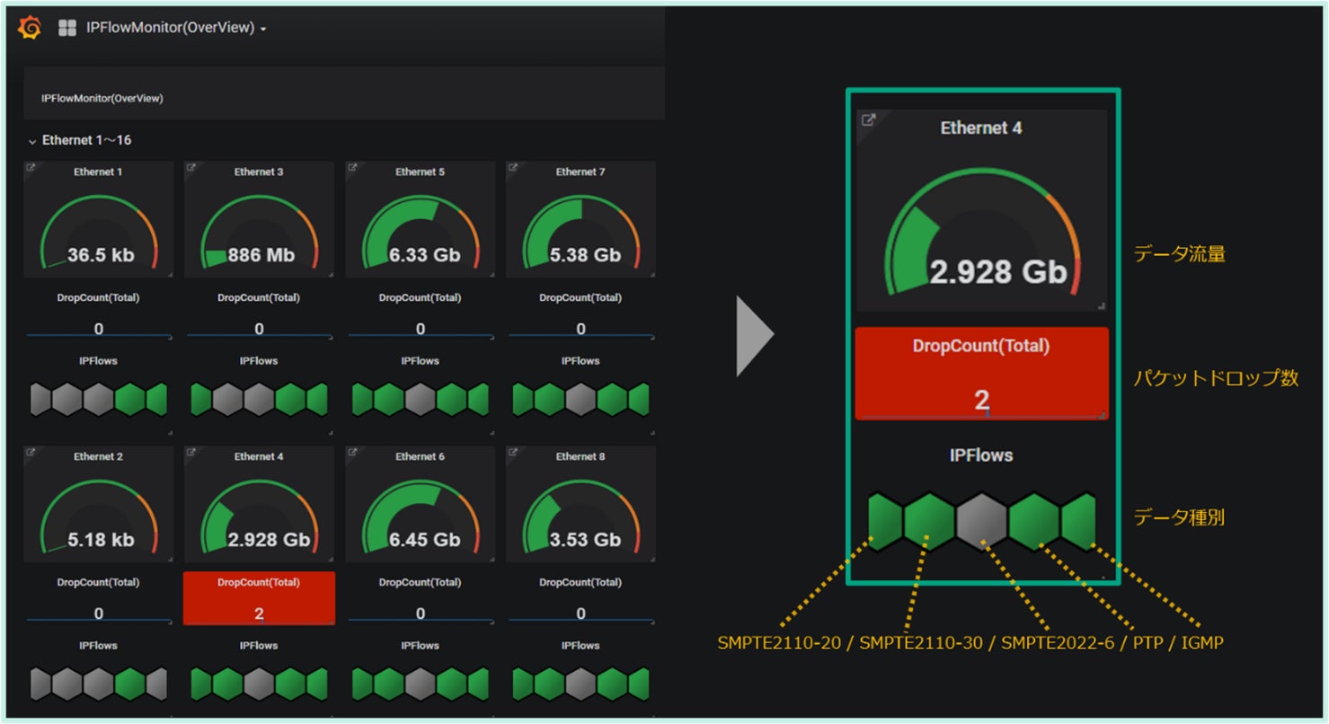 IP放送システムの通信状況を監視します。データ量や種別、パケットドロップの発生有無をリアルタイムで把握できます。SMPTE ST2110、ST2022 をはじめとする主要なデータ種別や、数千Gbpsを使用する大規模ネットワークに対応しています。
