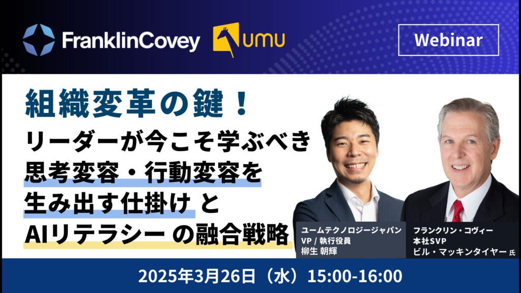 ユームテクノロジージャパン株式会社(本社:東京都新宿区、代表取締役:松田しゅう平、https://www.umujapan.co.jp、以下 ユームテクノロジージャパン)は、フランクリン・コヴィー・ジャパン社(本社:東京都千代田区、代表取締役社長:ブライアン・マーティーニ )と共同で、「組織変革の鍵!リーダーが今こそ学ぶべき”思考変容・行動変容を生み出す仕掛け”と”AIリテラシー”の融合戦略」と題するオンラインセミナーを、2025年3月26日(水)15:00〜より開催いたします。