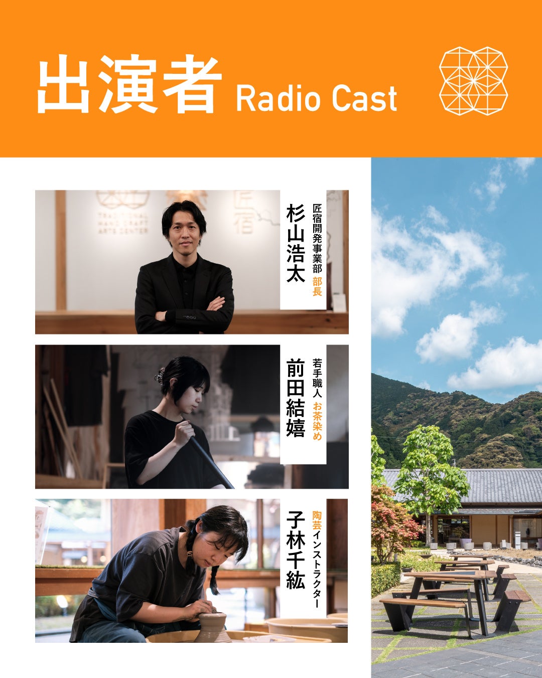 本放送では、DJ Roniさんを迎え 、匠宿開発事業部部長の杉山浩太より「匠宿CRAFT VALLEY」の魅力や、伝統工芸を受け継ぐ若手職人・インストラクターとのトークをお届けします。