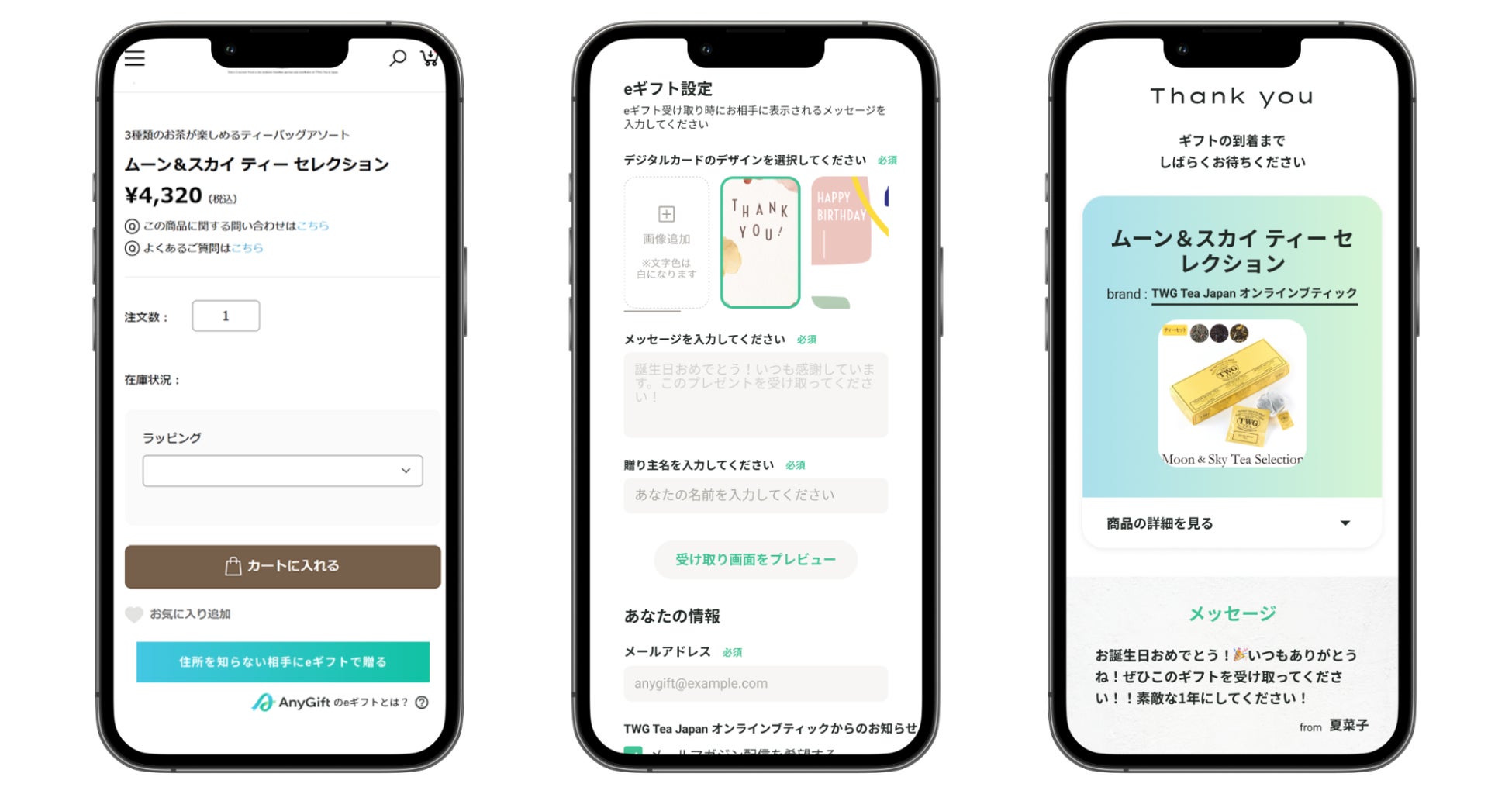 そこでこの度、お客様にもっと気軽にTWG Tea Japanの商品をプレゼントとしてご利用いただきたいという思いから、AnyGiftの導入を決定いたしました。