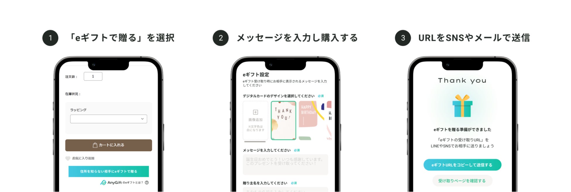 『AnyGift(エニーギフト)』は、相手の住所を知らなくてもLINEやメールで贈れる"eギフト機能"を、自社ECサイトに組み込み・導入ができるサービスです。