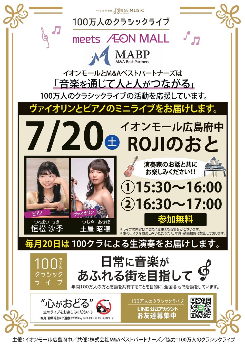 製造、建設、不動産、医療・ヘルスケア、物流、ITに特化したM&A仲介を⾏う株式会社M&Aベストパートナーズ(本社:東京都千代田区、代表取締役社長:齋藤 達雄 以下M&Aベストパートナーズ)は、イオンモール広島府中にて、クラシックライブ(協力:一般財団法人100万人のクラシックライブ 以下100万人のクラシックライブ)を、7/20(土)に開催することをお知らせいたします。