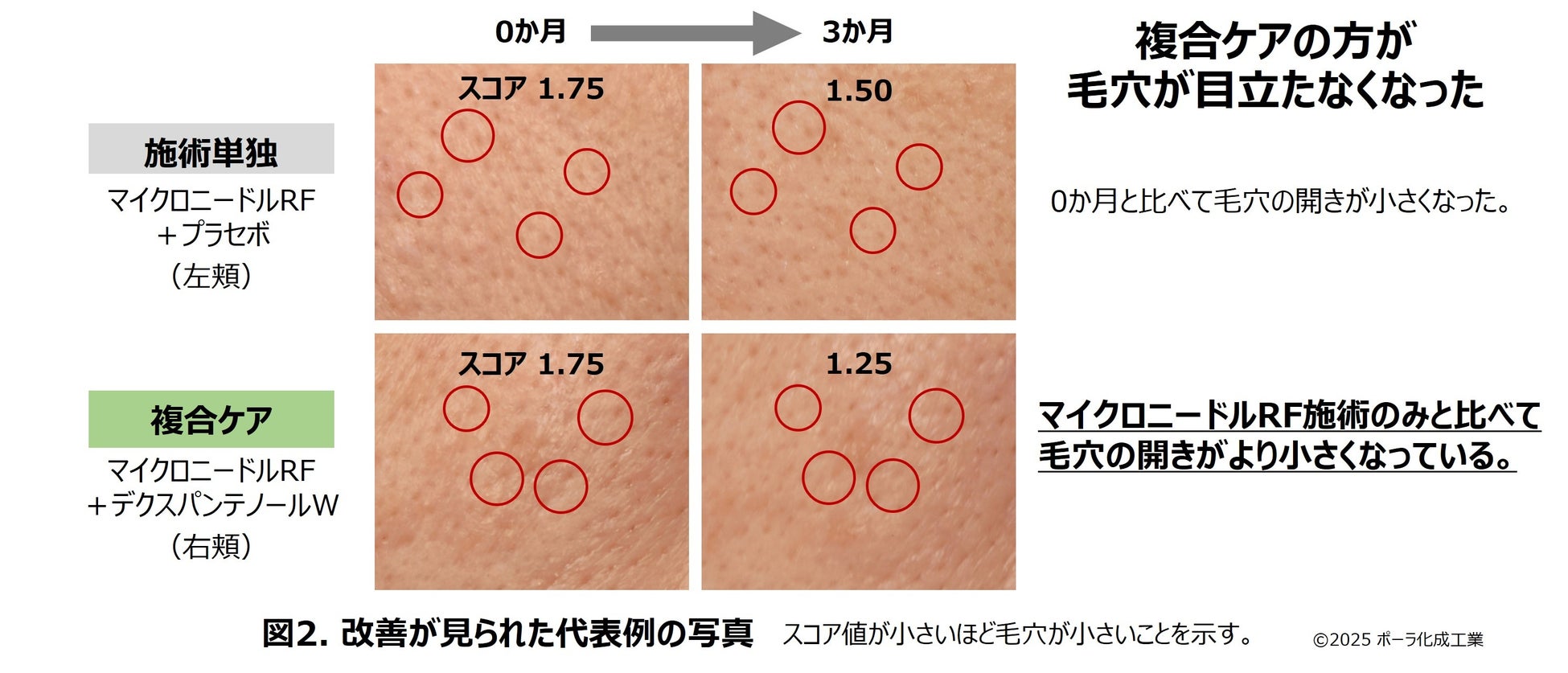 代表例の写真(図2)では、3か月後には複合ケアの方が毛穴の開きが小さくなったことが見て取れます。