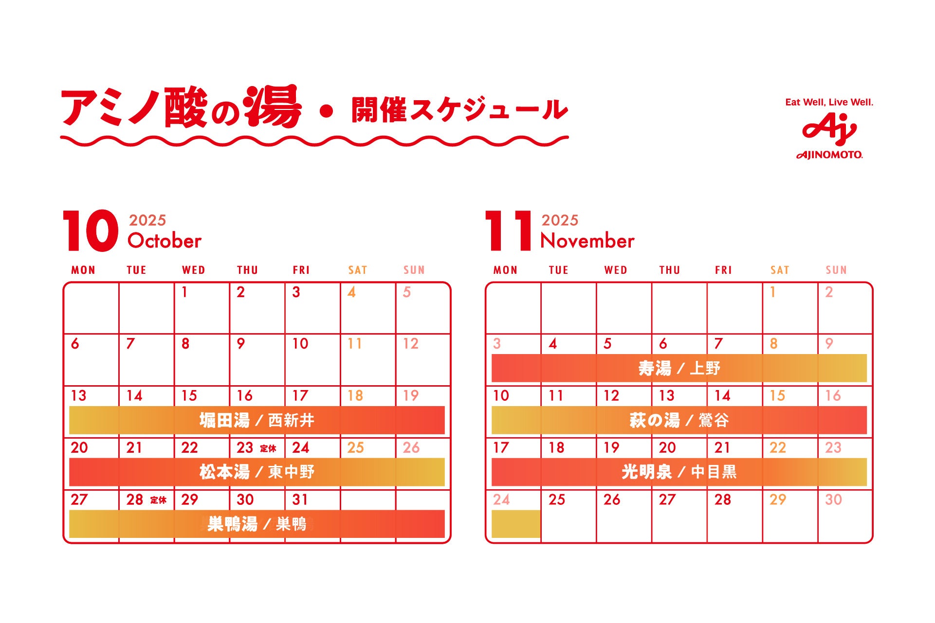 味の素株式会社(社長:中村 茂雄、本社:東京都中央区)は、”様々な仲間と日本人の調子をよくする”ことを目的とした「調子いいやつ!アミノ酸プロジェクト」の一環として、2025年10月13日(月)から11月24日(月)の期間、都内で人気の銭湯6店舗を「アミノ酸の湯」でジャックする取り組みを実施いたします。本企画は、今年の春に東京・大阪の銭湯8店舗とコラボレーションした「アミノ酸の湯」の第2弾で、疲れた体と心を癒す銭湯と再びタッグを組み、約2カ月にわたり、リレー形式で開催します。