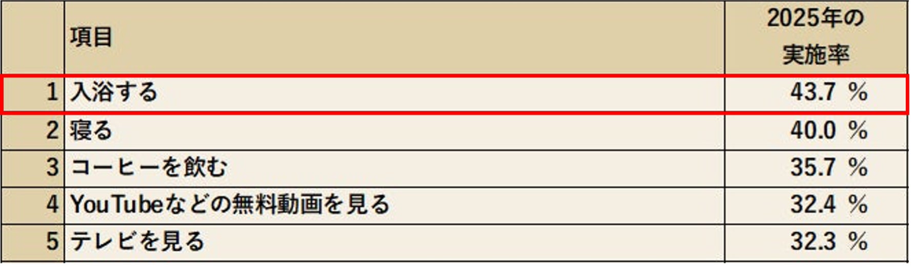 リカバリー(休養・抗疲労)行動の実施率の調査では、休息の王道である「寝る」を超えて、「入浴する」が43.7%でトップという結果となっています。この結果から、入浴は日常生活のなかで気軽にとれるリカバリー行動であることが分かります。