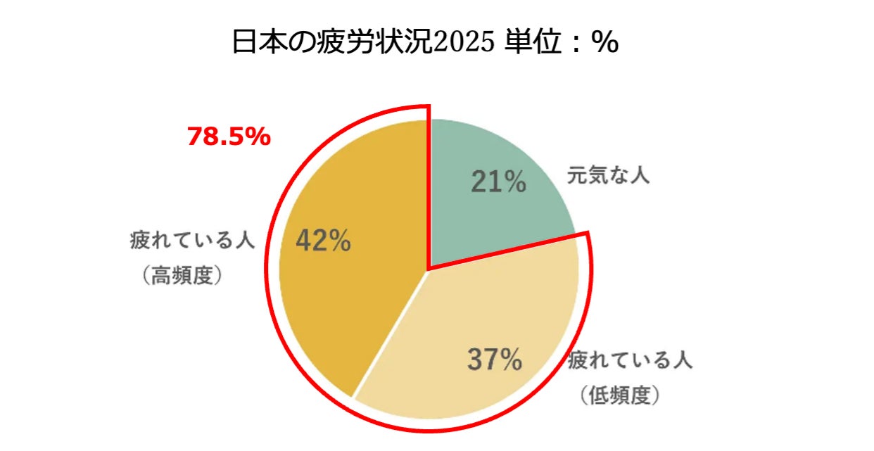 日本リカバリー協会が2025年4月から5月に実施した大規模調査「ココロの体力測定」によると、「疲れている」と回答した人は、低頻度・高頻度を合わせると78.5%におよび、約8割もの人が疲労感を感じている社会課題が浮彫になりました。さらに2024年と比較して「元気な人」が28.9万人も減少しており、日本人の疲労は深刻化しています。