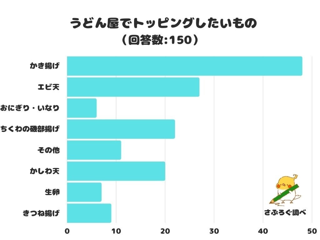 うどんだけでは物足りないと感じる方が多く、美味しいのはもちろんボリュームや栄養も考えてトッピングを選ぶ方が多い傾向にあるようです。
