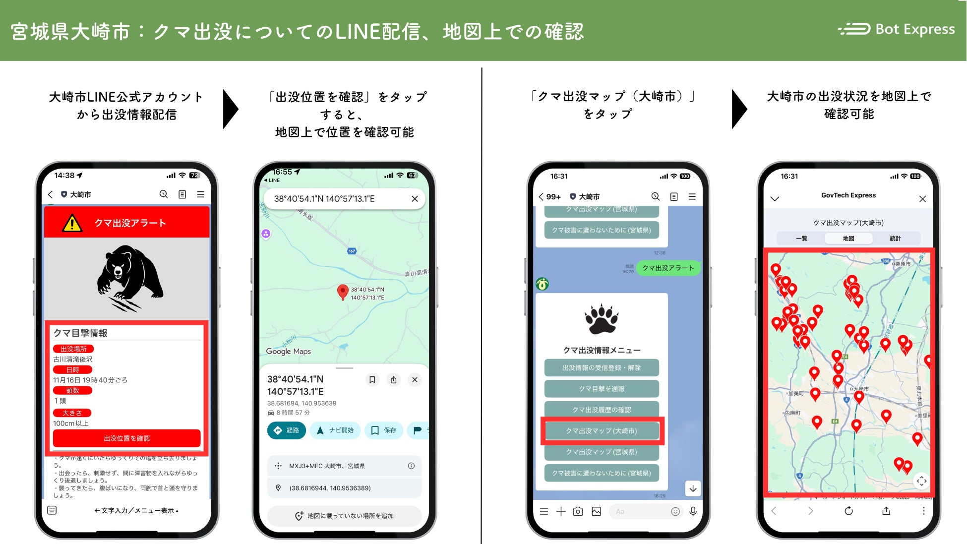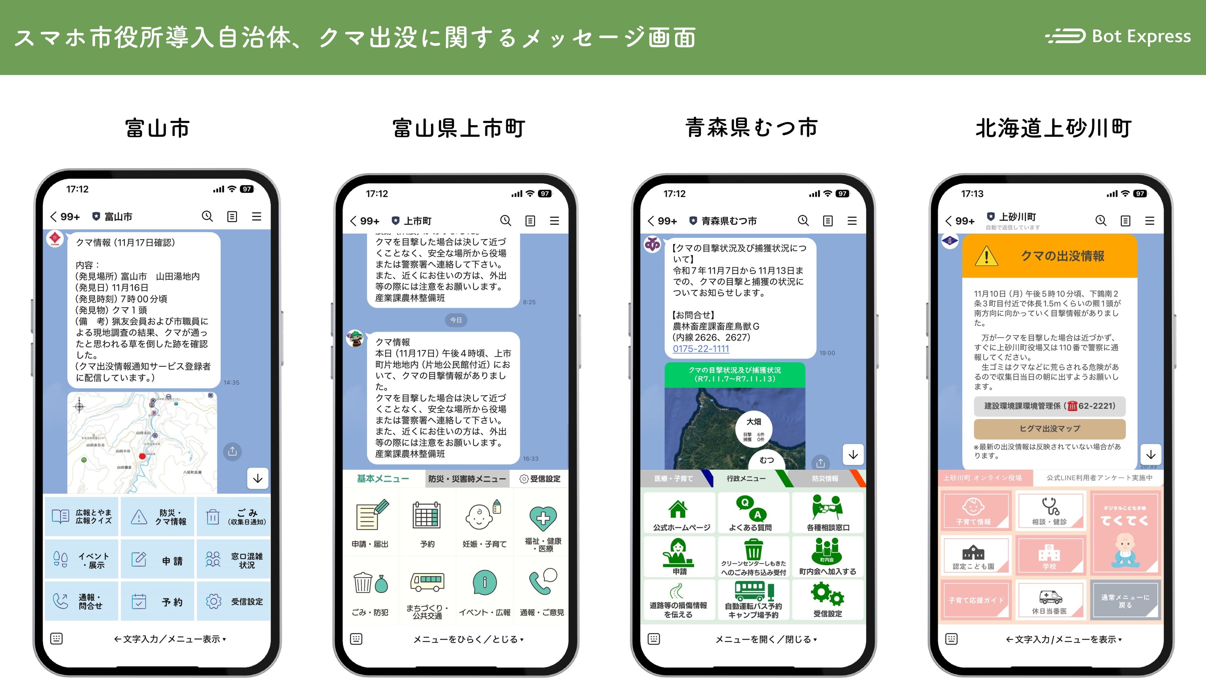 ほとんどの住民が、今、すぐに利用できるスマホ市役所「GovTech Express」を提供する株式会社Bot Express(本社:東京都港区、代表取締役:中嶋一樹、以下「Bot Express」)は、クマ出没時に住民がLINEで通報し、職員が現地からLINEで危険情報を配信できる「クマアラート機能」を提供しています。