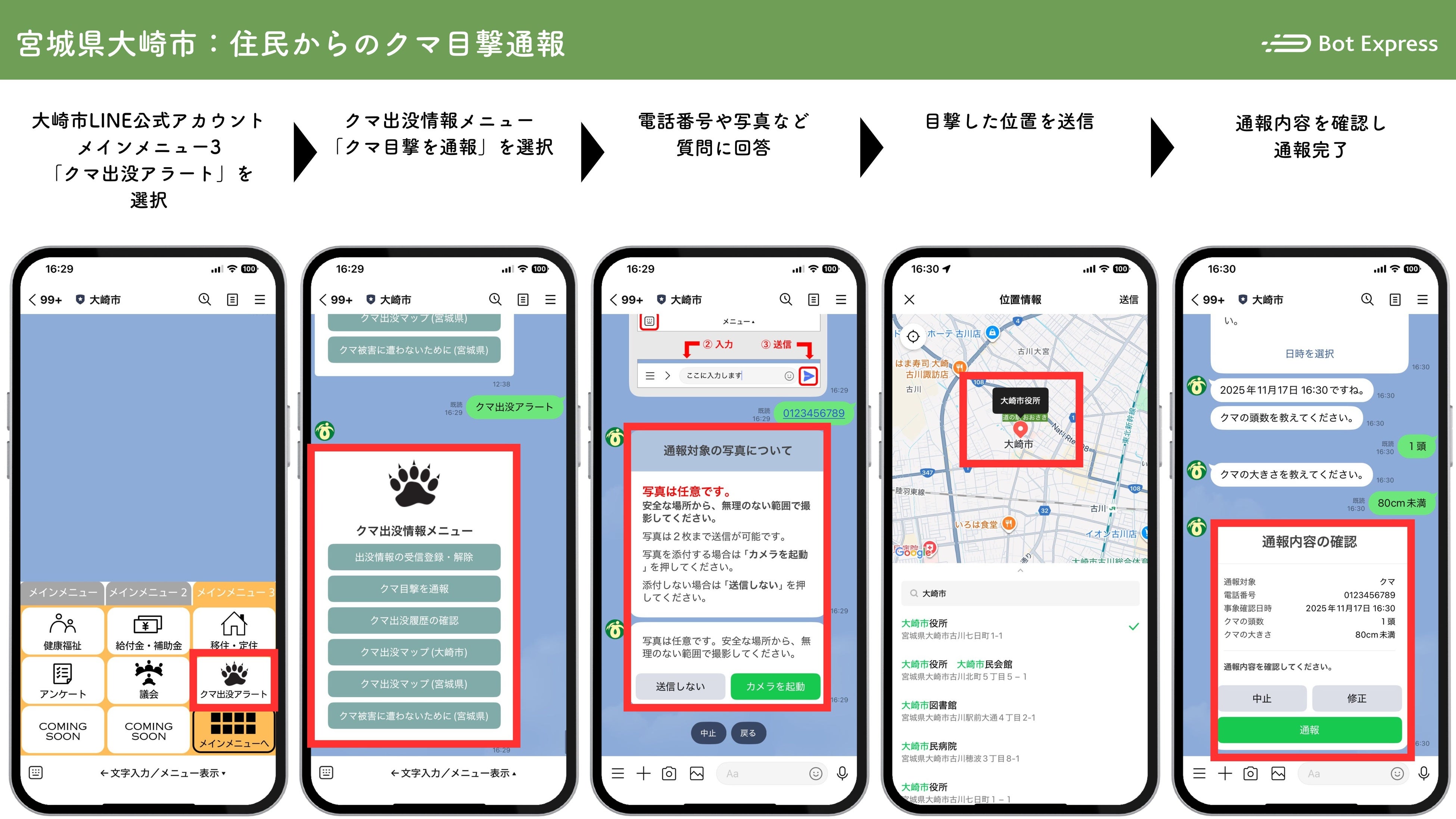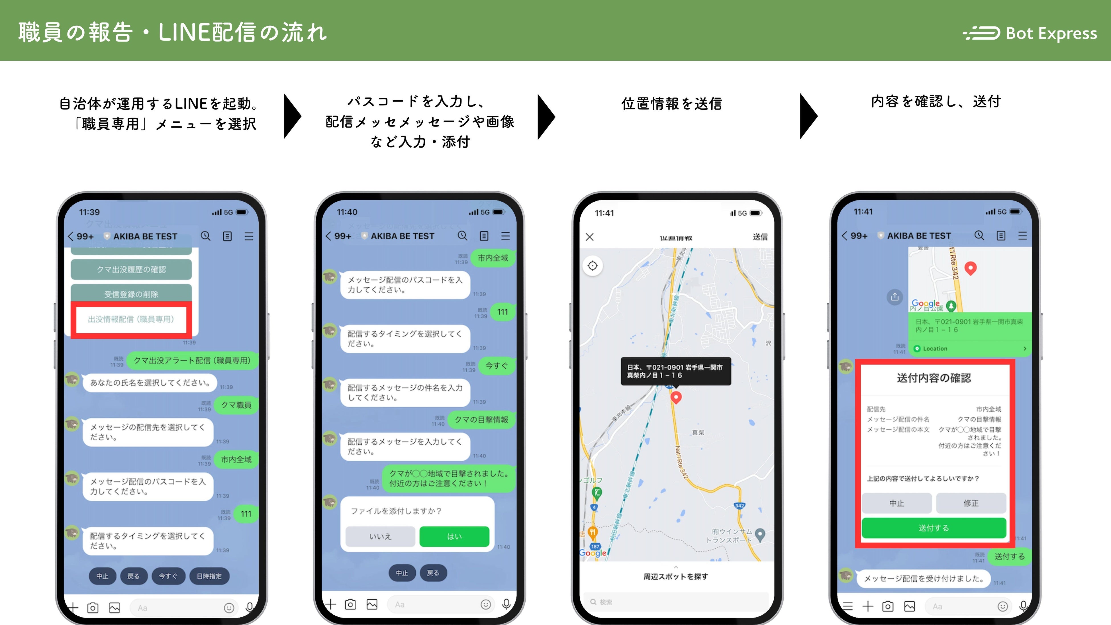 住民は、クマを目撃した際、LINEから位置情報や写真を添えて自治体へ通報が可能です。自治体が運用するLINE公式アカウントを活用することで、特別なアプリをインストールする必要がなく、多くの住民がすぐに利用できる点が特徴です。