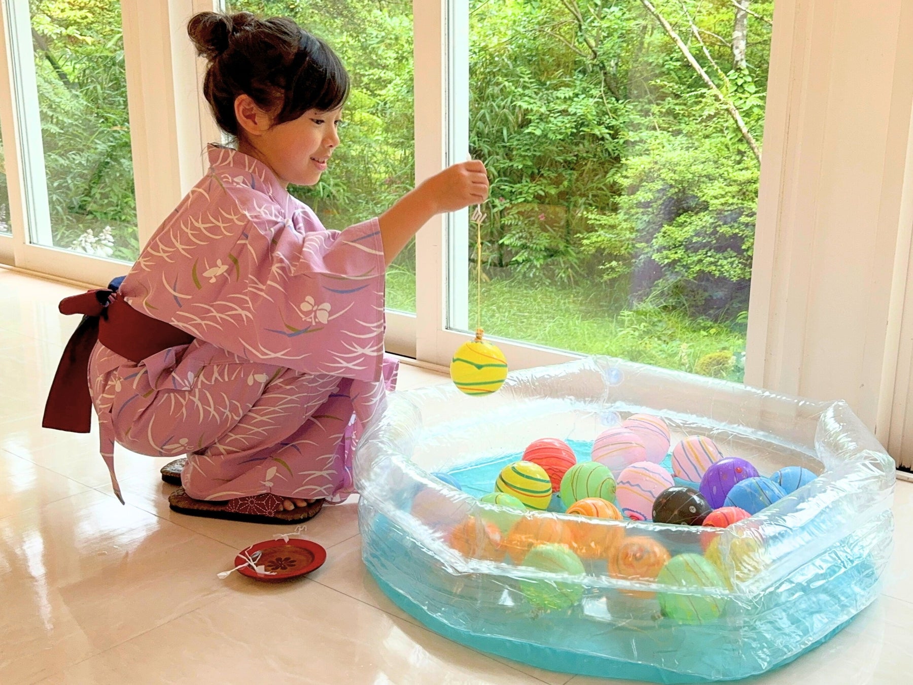 昔ながらの涼やかな遊びを親子で。水に浮かぶカラフルなヨーヨーを釣り上げる縁日の定番遊び。