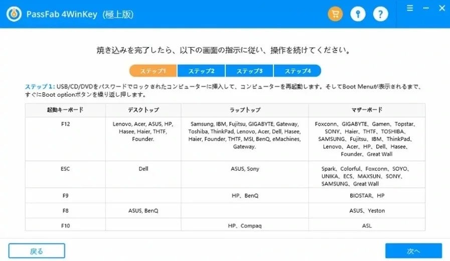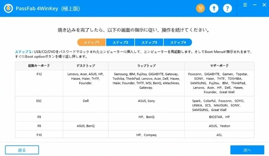 Step3:書き込みが完了したら、PassFab 4WinKeyを起動したパソコンに表示される下記の表を参考に、パスワードを変更したいパソコンに起動ディスクを挿入してブートメニューを立ち上げます。