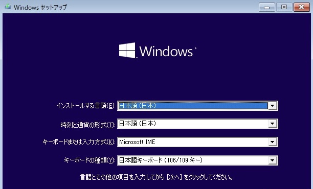 Step3:下記のWindowsセットアップ画面が表示されたら、ShiftキーとF10キーを同時に押して、コマンドプロンプト画面を開きます。