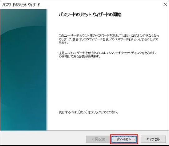 Step4:「パスワードのリセット ウィザード」画面が表示されますので、「次へ」をクリックし、パスワードリセットディスクを挿入したドライブ名を選択します。