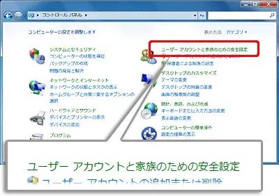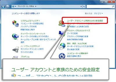 Step1:管理者アカウントでパソコンにログインし、スタート>コントロールパネル>「ユーザー アカウントと家族のための安全」の順にクリックします。