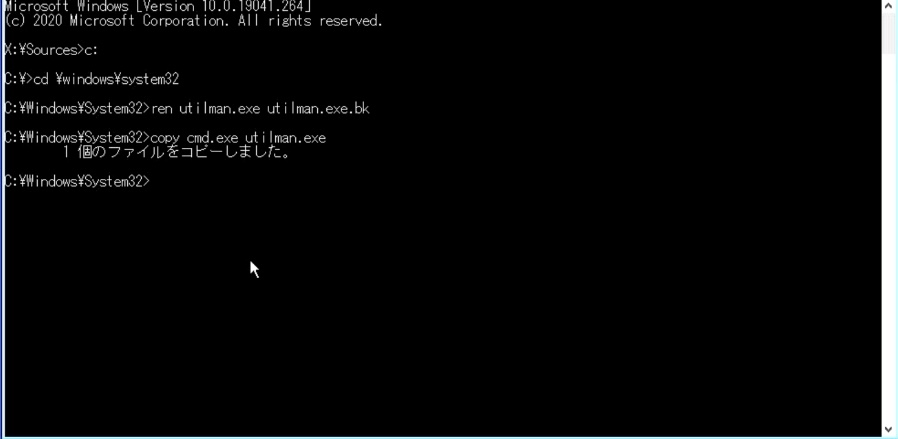 Step5:下記のコマンドを1行ずつ順番に入力してEnterキーを押し、「1個のファイルをコピーしました」と表示されたら、コマンドプロンプトおよびWindowsセットアップ画面を閉じます。インストールメディアは取り外しておきましょう。