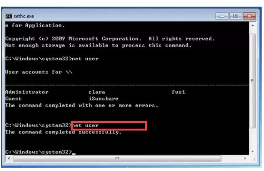 Step7:コマンドプロンプト画面が開きますので、下記のコマンドを1行ずつ順番に入力してEnterキーを押すと、新しいパスワードを設定できます。