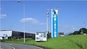 空港入口看板や旅客ターミナルビル外壁のくまモン装飾が阿蘇くまもと空港を訪れる方々を出迎えます。このほか、階段や床面などもシートで飾り付け、写真映えするフォトスポットも設置します。