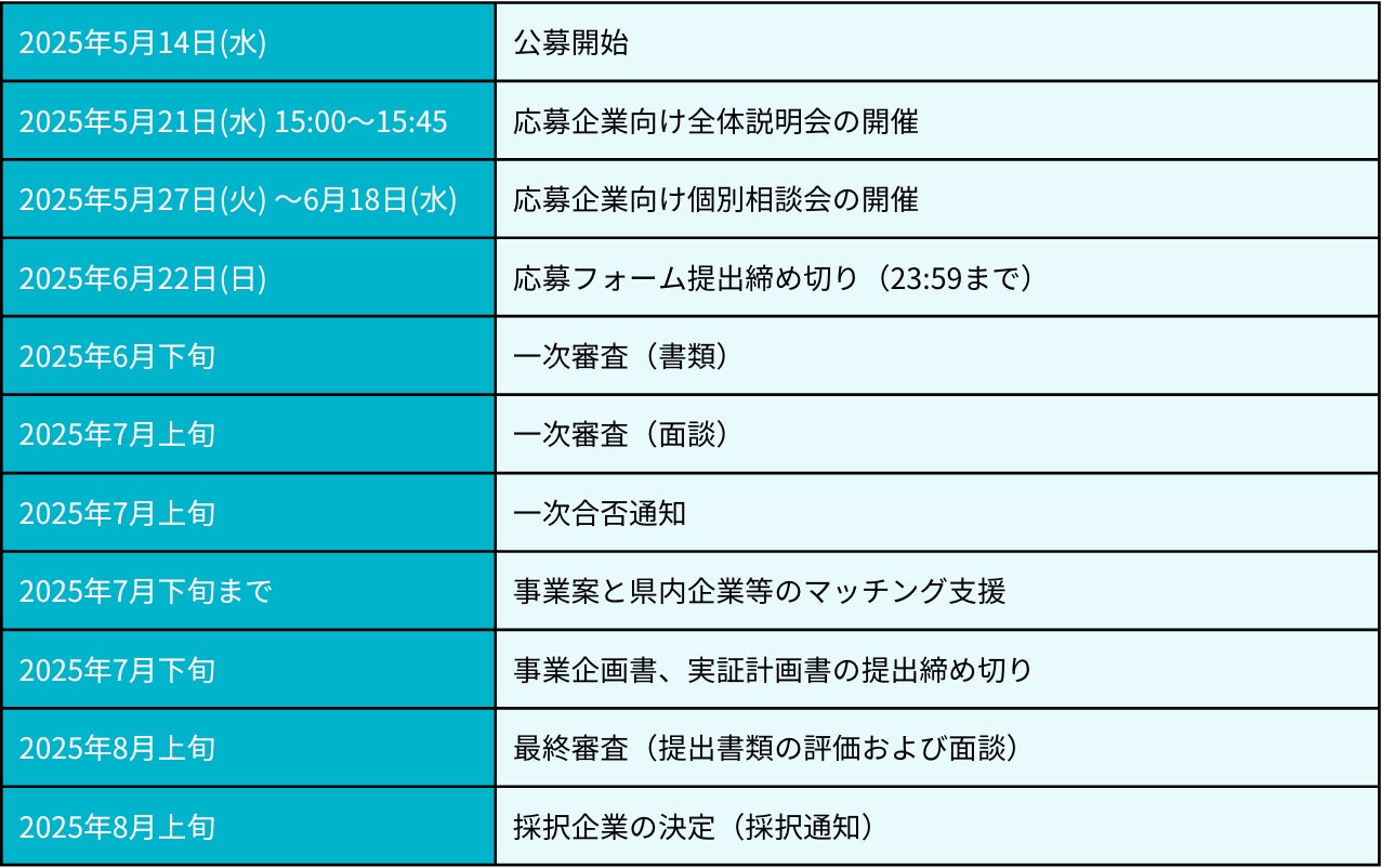 応募受付は、2025年5月14日(水)より開始し、同年5月21日(水)には先進的な技術やサービスを有する、国内外のスタートアップ、ベンチャー、地域の中小企業、大企業などを対象に応募に向けたオンラインでの全体説明会を実施します。