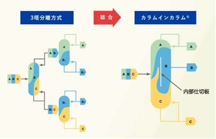 一般的な多成分系蒸留システムでは、複数の蒸留塔を連ねることで分離を行っていますが、各蒸留塔で加熱・冷却を繰り返しているため、蒸気・熱媒・冷却水等のユーティリティの使用量が多くなりランニングコストが大きくなります。これに対し、カラムインカラム®は、蒸留塔の内部に塔を垂直に分割する仕切板(しきりいた)を設置する構造とすることで、複数の蒸留塔の機能を1塔に統合し、ユーティリティ使用量の削減に寄与します。