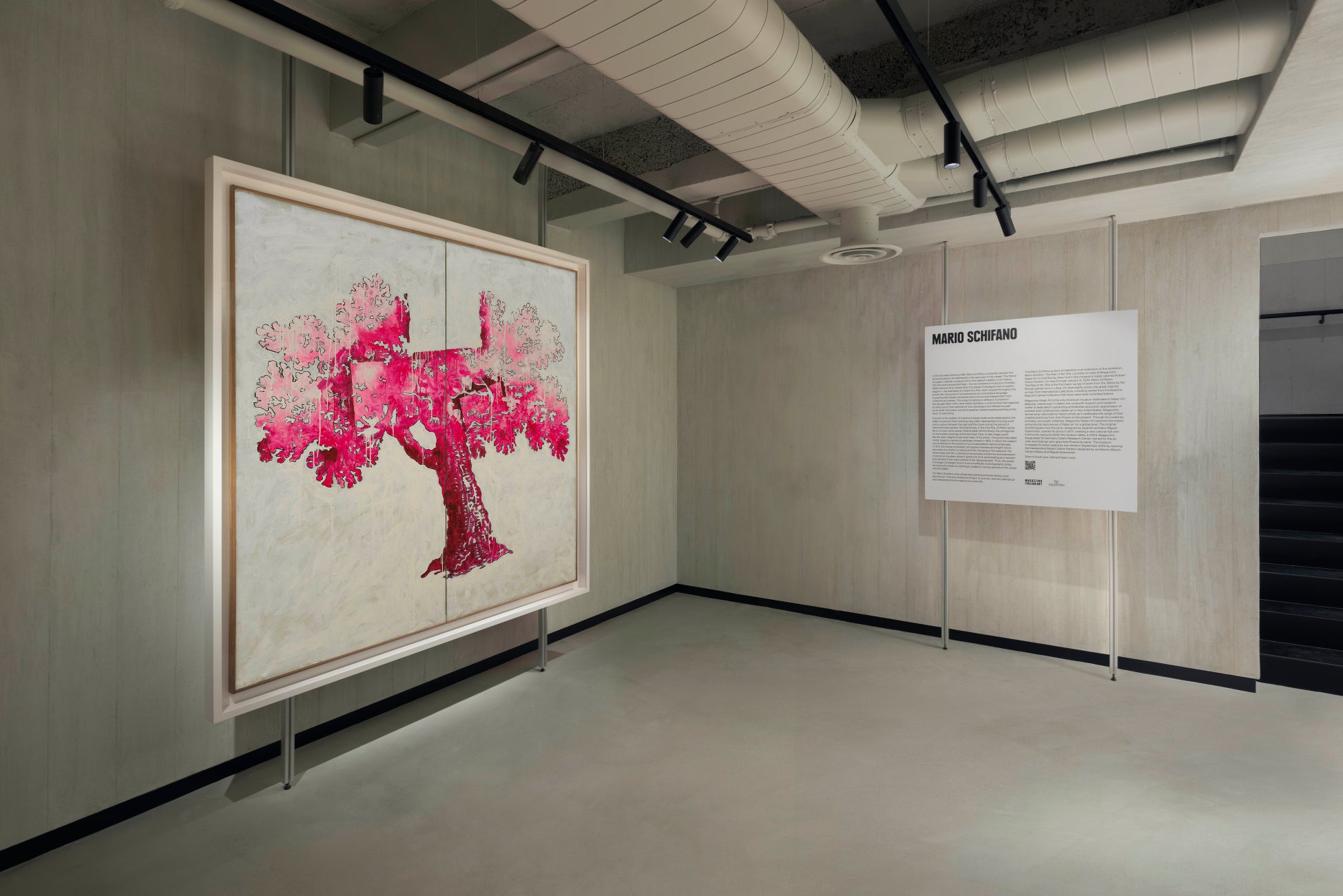 建物の中2階は、一辺がストアの1階に面するコンクリートボックスになっていて、さまざまなギャラリーや機関の多様なアート作品を期間限定で展示する場として使用されます。オープンを記念する展示第一回目は、世界のアートやビジュアルカルチャーを支援するヴァレンティノの取り組みの一環として、ニューヨークのミュージアム、マガッツィーノ イタリアンアートとのパートナーシップにより、マリオ・スキファーノの大型の絵画作品を展示します。