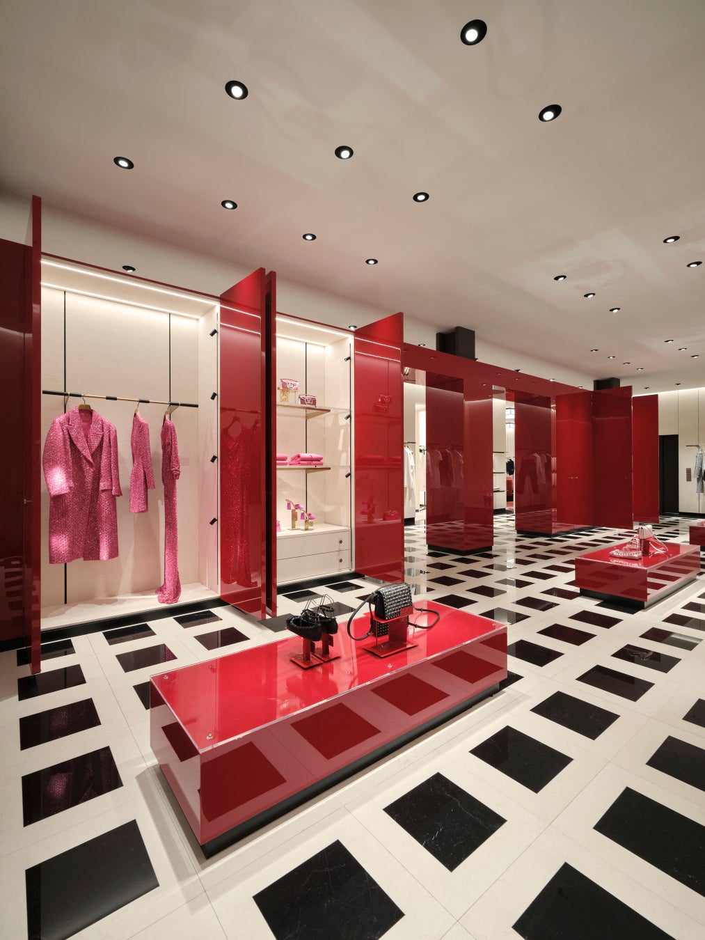 2階のウィメンズ プレタポルテコレクションエリアは、ホワイトボテチーノとブラックネロマルキーナを用いた格子柄のフロアと、レッドカラーにラッカー塗装された巨大なワードローブ、同色のシーティングエリアがコントラストを描く空間です。