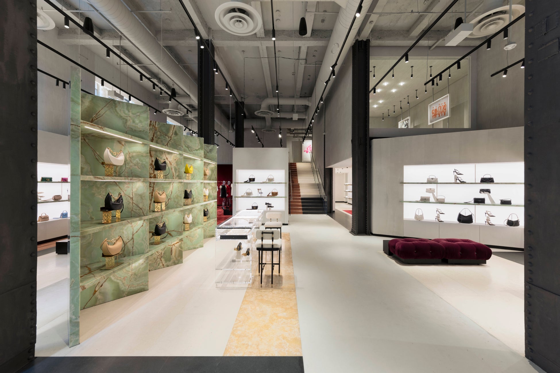 中に入ると、7メートルの天井やヴァレンティノ ガラヴァーニの小物用の照明付きディスプレイ棚と交互に配されたむき出しのアイコニックなスチール製の柱、その外周に施されたコンクリートの仕上げなど、堂々たる要素が視界に飛び込んできます。中央に配された印象的なグリーンオニキス製のディスプレイユニットといったカスタムメイドのエレメントや、マーブルカーペットやコンクリートフロアなどの素材や質感の違いによって、空間が機能ごとに仕切られています。