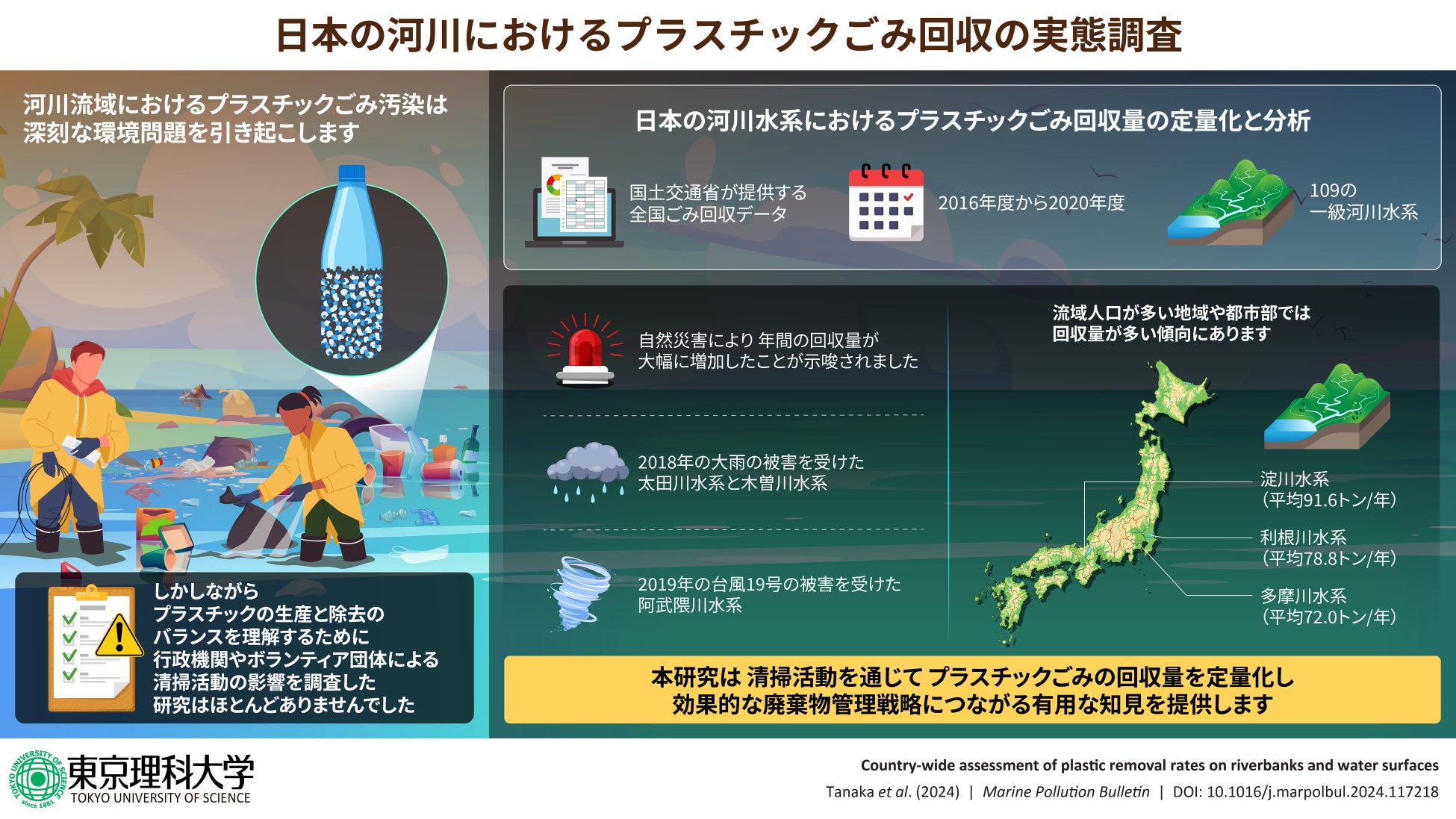 東京理科大学 創域理工学部 社会基盤工学科の田中 衛助教、岡田 友萌菜氏(2022年度 同大学理工学部土木工学科卒業、現 オリエンタルコンサルタンツグローバル)らの研究グループは、日本全国の市民、行政による河川清掃活動のごみ回収量データを整理し、年間およそ1000トンのプラスチックごみが回収されていることを明らかにしました。これは、日本全国のプラスチックごみ回収量を定量的に評価した初めての研究です。