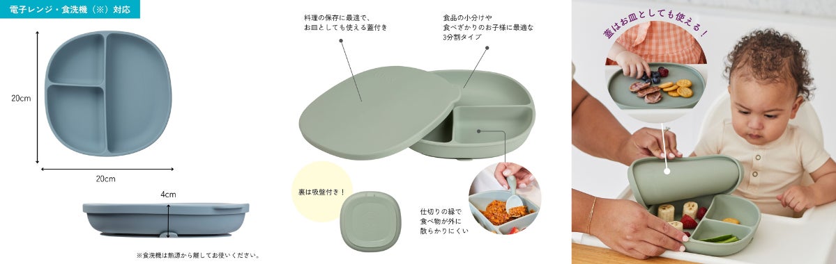吸盤付きなのにスタイリッシュで使いやすさを追求したデザインのシリコンプレートは離乳食だけでなく、おやつにも対応します。