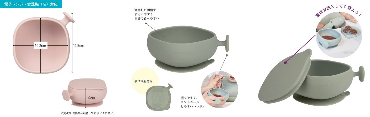 取っ手のついたユニークな形のボウルは、離乳食初期のママやパパがサポートしながら食べさせてあげる時期から、中期、後期に向かってお子さんが自立した食事に移行できるようデザインされています。