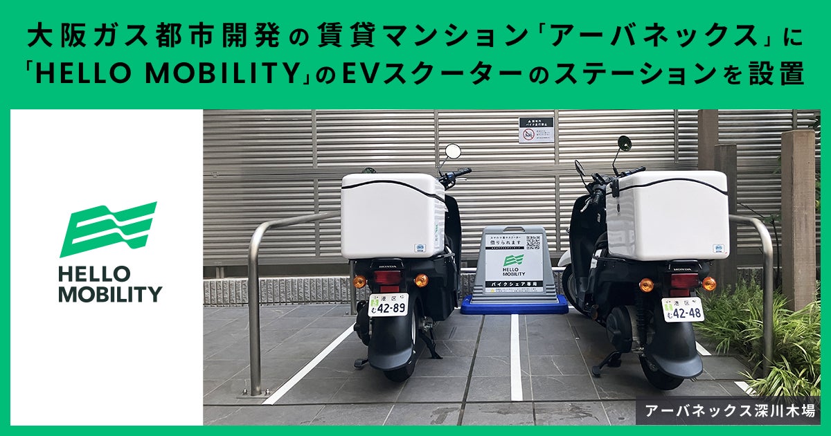 OpenStreet株式会社(本社:東京都港区、代表取締役社長CEO:工藤 智彰、以下「OpenStreet」)は、大阪ガス都市開発株式会社(本社:大阪府大阪市、代表取締役社長:友田 泰弘、以下「大阪ガス都市開発」)が、首都圏・関西に113棟6,365戸(2024年7月末現在)所有する賃貸マンション「アーバネックス」の一部物件に「HELLO MOBILITY」のEVスクーター(BENLY e: Ⅰ)のステーションを設置したことをお知らせします。今回設置した場所は、東京都江東区のアーバネックス森下Ⅳおよびアーバネックス深川木場、東京都品川区のアーバネックス大井仙台坂の3カ所の駐車場・駐輪場で、今後はさらに設置場所を拡大していく予定です。
