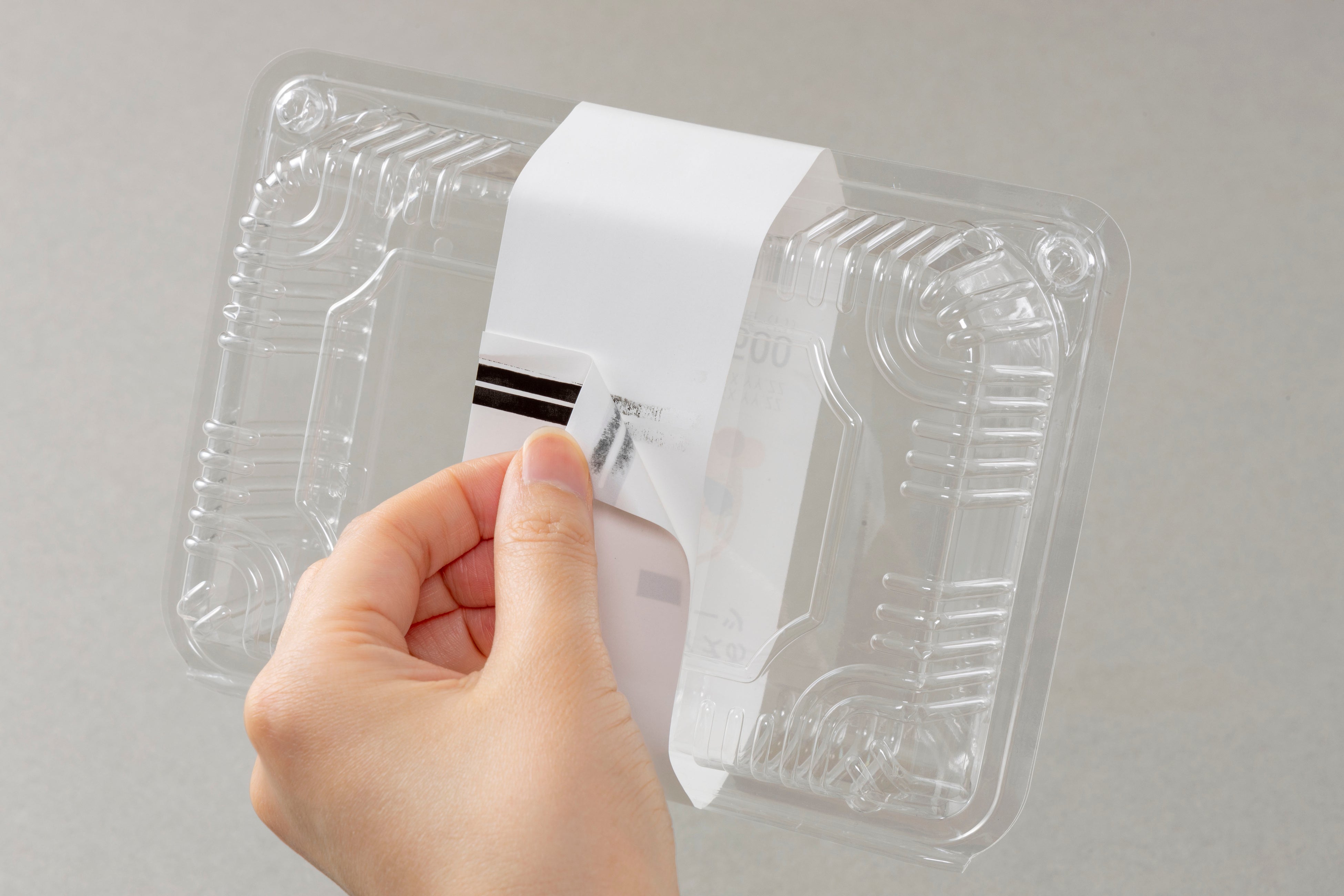 本製品は表面のサーマル層がサーマルヘッドの熱エネルギーに対して耐熱性があること、裏面はヒートシール層が比較的低温で溶解するという、2つの相反する特性があります。これにより、ダイレクトサーマル印字と熱圧着が同時に行えることが特長です。印字の際は、サーマルヘッドを損傷せず安定した品質を維持します。また、ロール状の資材は通常保管時に表面と裏面の固着(ブロッキング現象)が発生しやすく、テープ状の結束資材では粘着剤が結束する商品に付着するトラブルが起きやすいことが課題でした。本製品は粘着剤不使用かつ、特殊なヒートシール層を積層しているため前述の課題を解決しました。