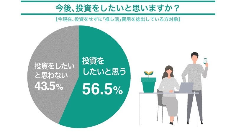 現在投資をしていない「推し活」者に今後投資をしたいか聞いてみたところ、半数以上の56.5%が「投資をしたい」と回答しました。「節約」や「ポイ活」、「収入の余剰」など消費行動から「推し活」費用を捻出している方も、半数以上が今後「投資」を行いたいと考えていることがわかりました。