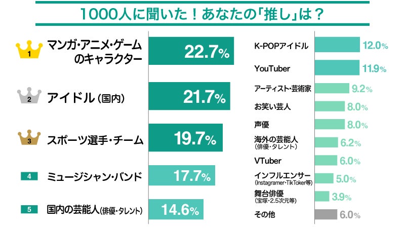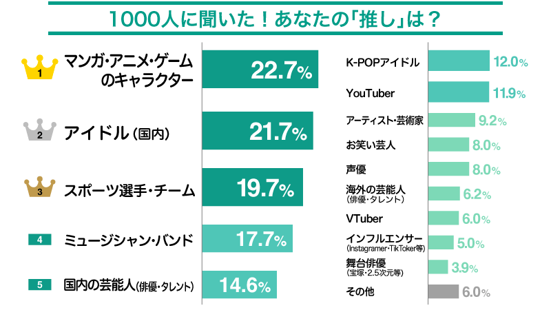 ①「推し活」で人気なのはマンガ/アニメ/ゲームのキャラクター、次いで国内アイドル。スポーツ選手やミュージシャンも人気