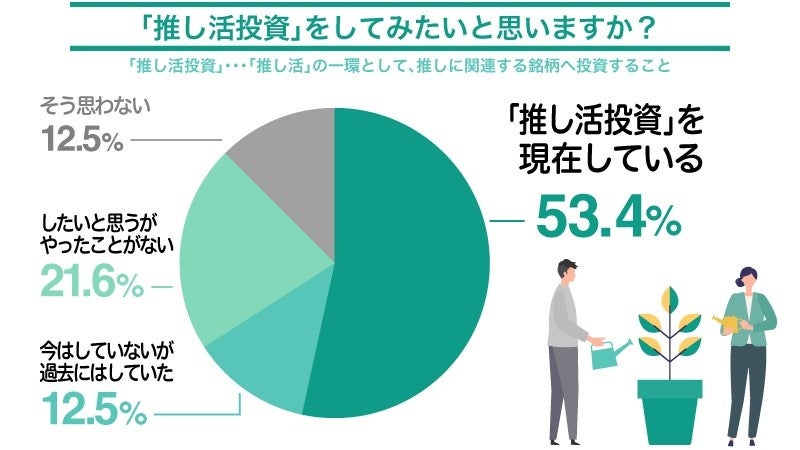 「推し活」の一環として、推しに関連する銘柄へ投資することを「推し活投資」と呼びますが、実際に「推し活」費用を「投資」で捻出している人の半数以上となる53.4%が「推し活投資」を行っていることがわかりました。また、「推し活投資」を行う際の、重視している点、基準としている指標や銘柄の選び方について具体的に聞くと、「推しが広告に出ている企業の株を買う」(東京都30代男性)、「推しの所属事業所を持分法適用会社として保有している会社に投資したので、資本関係のあるところにしている」(東京都20代男性)、「推しタレントの所属事務所の株を購入して株主優待をもらう。」(神奈川県50代男性)などの声が聞かれました。