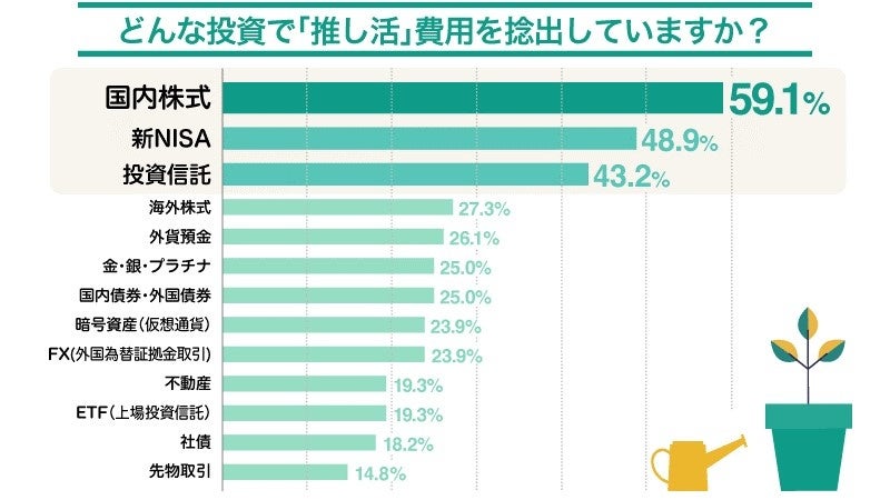 なお、「推し活」の費用を「投資」(8.8%)で捻出しているという人に、どのような投資をしているか訪ねたところ、「国内株式」(59.1%)、「新NISA」(48.9%)、「投資信託」(43.2%)が上位に入りました。(複数回答)