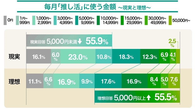 月に「推し活」に使っている金額は5,000円未満が55.9%となり、10,000円以上を「推し活」に使っている率を上回りました。一方で、理想の「推し活」に使いたい金額を聞いてみると、5,000円以上が