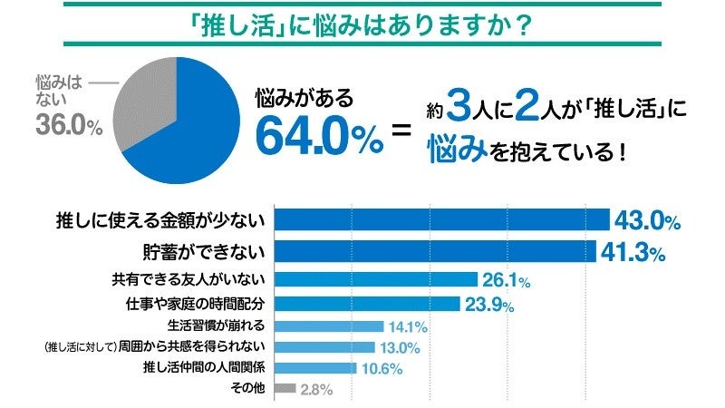 ②「推し活」をしている人の3人に2人は悩みを抱えており、悩みは「推しに使える金額が少ない」が最多で「貯蓄ができない」が続いた。