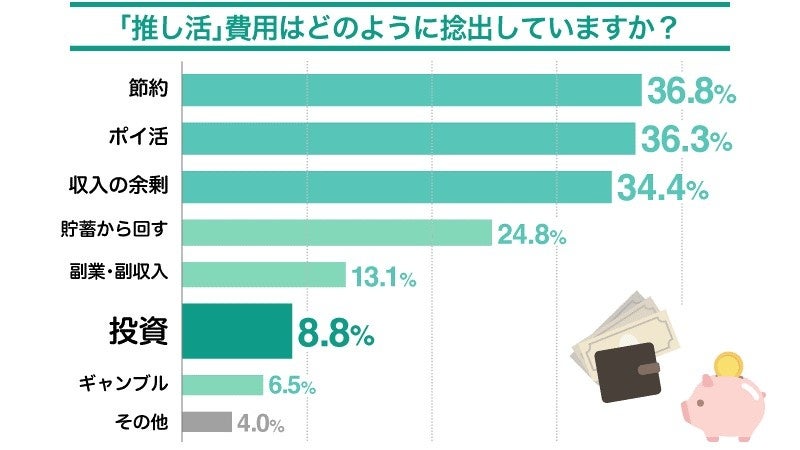 「推し活」の費用をどのように捻出しているか訊ねたところ「節約」(36.8%)がトップで「ポイ活」(36.3%)、「収入の余剰」(34.4%)が続きました。その他、「投資」(8.8%)から「推し活」費用の捻出をしている方もみられました。(複数回答)
