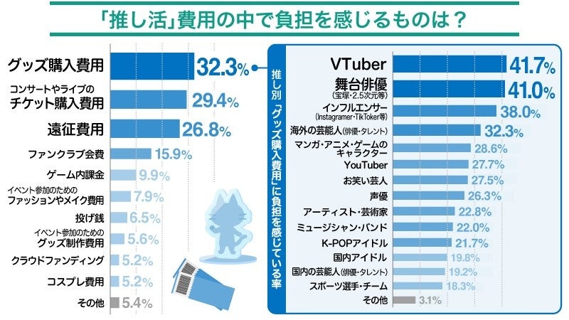 ③推し活費用の中で負担に感じる「グッズの購入費用」、「VTuber」推しでの割合が最多となる。